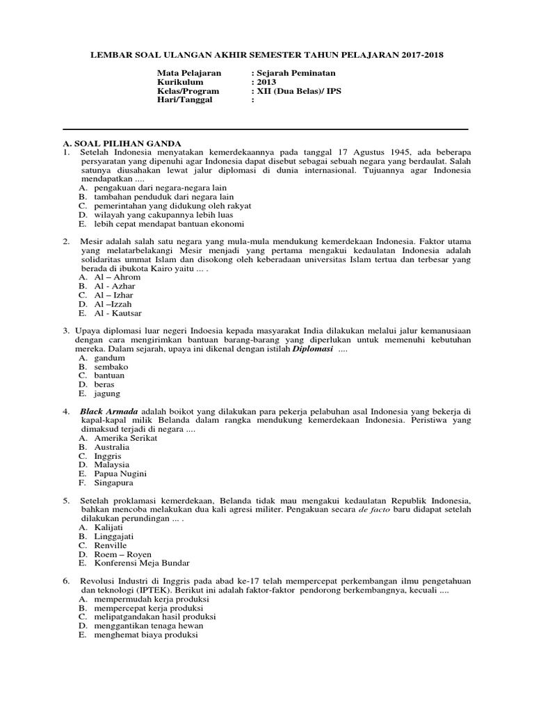 Sejarah Peminatan Kelas 12 Semester 1 Kurikulum 2013 - Download Kisi Kisi Pas Sejarah Indonesia Kelas 12 Tahun 2019 2020 Raja Soal : Berikut di bawah ini, soal essay/uraian ekonomi peminatan kelas 12 semester 1 dilengkapi kunci jawaban kurtilas edisi revisi dengan pertanyaan jawaban :. Arya portoolio yang dikumpulkan adalah laporan seluruh hasil ran$angan/rakitan alat dan laporan praktikum bidang studi studi <b>semester 1 6raian tugas porto<b>olio 1. Isi dalam buku ini yakni mengenal akuntansi dan menjadi tonggak sejarah dalam bidang akuntansi. Respon internasional terhadap proklamasi kemerdekaan indonesia. Mekanisme dan cara kerja sekelompok orang yang memp. Rpp sejarah peminatan kelas 12 semester 1.